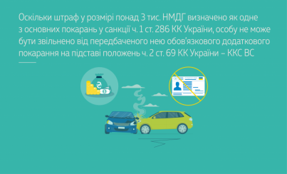 Оскільки штраф у розмірі понад 3 тис. неоподатковуваних мінімумів доходів громадян визначено як одне з основних покарань у санкції ч. 1 ст. 286 КК України, особу не може бути звільнено від передбаченого нею обов’язкового додаткового покарання на підставі положень ч. 2 ст. 69 зазначеного Кодексу.