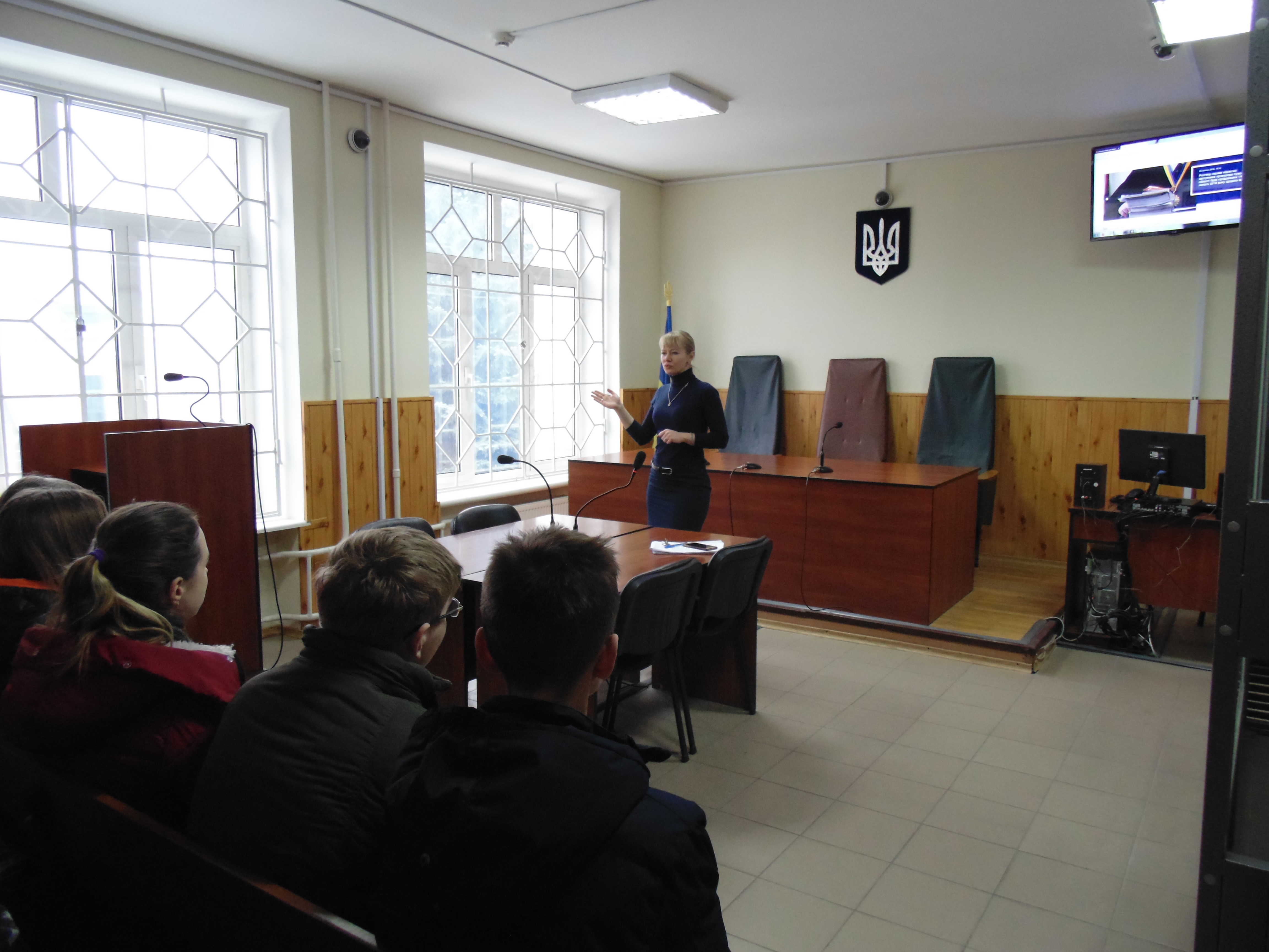 Потім юних відвідувачів запросили до зали судових засідань, де вони спілкувалися із керівником апарату суду Аллою Шевченко. У форматі відкритого діалогу разом із керівником апарату школярі з’ясували, які саме місця в залі судового засідання займають судді, прокурори, адвокати, секретар судового засідання, а також підозрюваний чи обвинувачений. Разом з’ясували, що до судді потрібно звертатися словами «Ваша честь», а усім присутнім у залі судового засідання потрібно вставати коли суддя заходить чи виходить із залу.